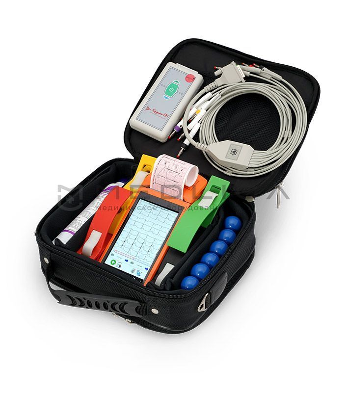 - Состоит из электрокардиографического преобразователя и карманного персонального компьютера (КПК) в виде планшета c цветным сенсорным дисплеем и со встроенным термопринтером