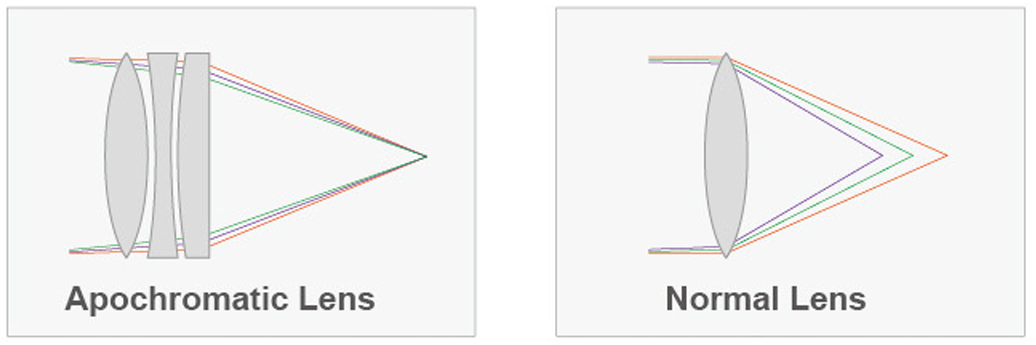 В отличие от обычных линз, апохроматические линзы имеют особую конструкцию, которая позволяет фокусировать свет разной длины волны в одной точке, устраняя хроматические аберрации (цветовые искажения), которые могут возникать в обычных линзах.