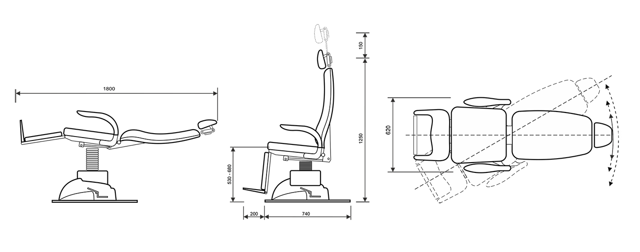 Положение "операционный стол" Возможность опустить спинку кресла до положения 180° с помощью ручного рычага с пневматической пружиной, расположенного сбоку от сиденья. Гидравлическая система для подъема, запускаемого газовым насосом через ножной блок управления, расположенный в нижней задней части основания;